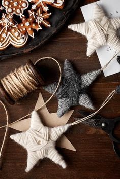 Recyclez le carton : découpez une forme d'étoile, et enroulez de la laine autour : vous obtiendrez de jolies suspensions.