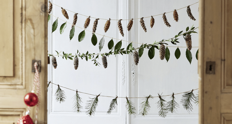 Profitez de vos promenades, du jardin pour ramasser de quoi faire des guirlandes : un peu de ficelle, des pommes de pin, des petites branches de sapin, des feuilles.